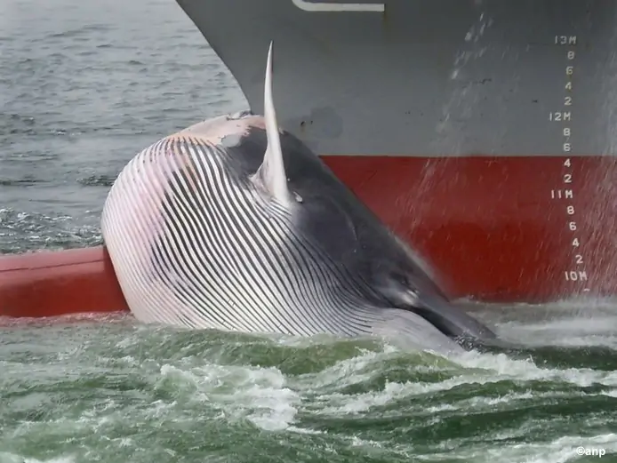 Fin whale bow-caught by a containership (image source www.ad.nl)