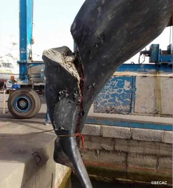 Broken tailstock of a young sperm whale as result of a collision with a boat in the Canary Islands. This individuals was very well known in the Azores