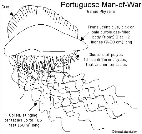 All the zooids belong to the same species but differentiate in several types to assolve different vital functions, from the siphon inflated with gas that sustains the colony, to the long stinging tentacles used for hunting small fish and plankton. Their venom is extremely painful and can even be deadly for humans, especially if multiple stings occur.