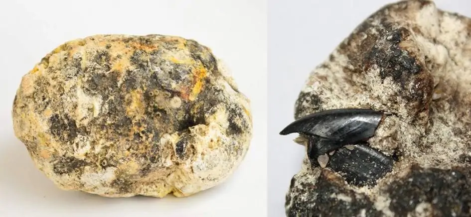 Prepared piece of Grey Amber, ready for auction (left) and beak of a squid enclosed inside of Grey Amber (right). Source: Left: Adam Partridge Auctioneers & Valuers. 2019. Right: Ambergris NZ Ltd. 2017.