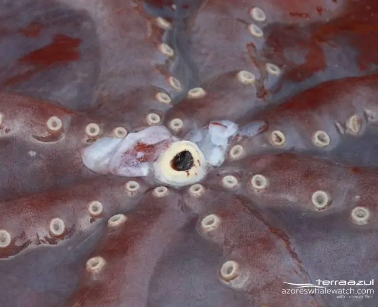 The octopuses were always recovered in areas where Sperm Whales (Physeter macrocephalus) were diving to feed, suggesting that these whales could be behind the lack of the head. Why the whales do not consume the whole animal still remains a mystery. Maybe Azorean Sperm Whales have quite particular meal preferences! 😀 😀 😀