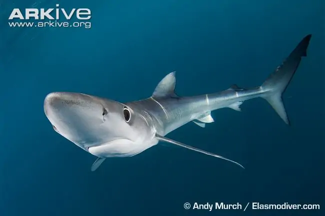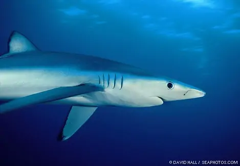 Blue sharks get their name from their blueish skin. They have a slim body, long fins and a cone snout with triangular teeth, and is the most distributed shark in the world. They go everywhere except in the Antarctic ocean and as pelagic sharks, they are often spotted just below the surface of deep waters. However, the shark does prefer cold waters near squids breeding grounds, where they can hunt.