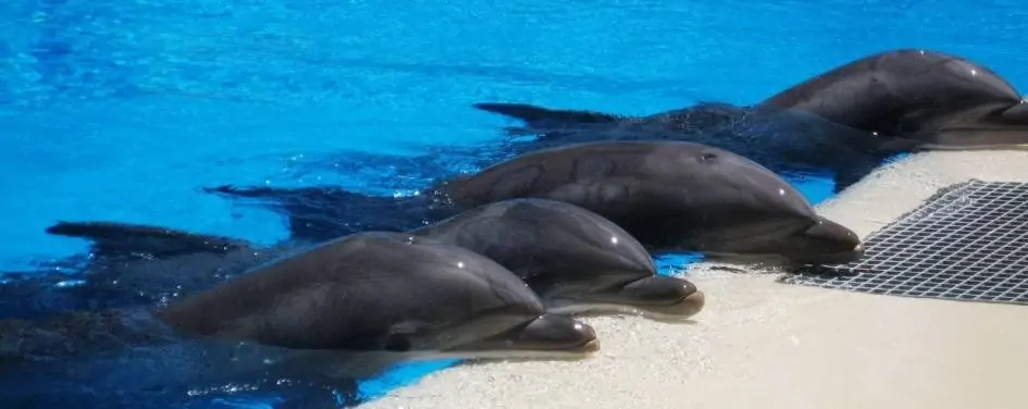 Bottlenose Dolphins (Tursiops truncatus) obeying orders from their trainer in order to receive one fish to eat. Source: https://us.whales.org/2016/06/08/captive-dolphin-facility-in-singapore-to-close/