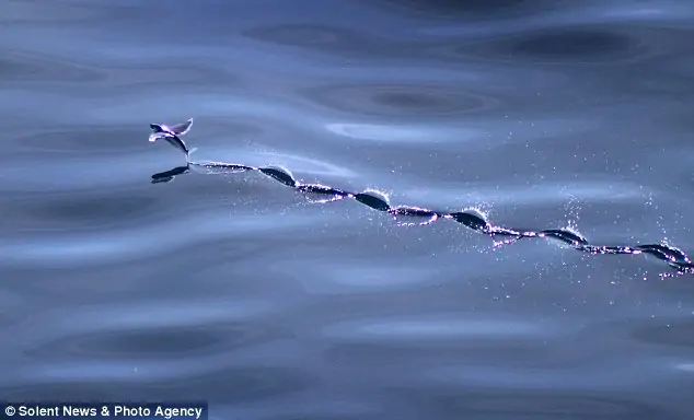 They start to gain velocity underwater, then make an angle upwards to break the surface and start to beat their tail very rapidly on the water while they’re still on the water, only afterwards they take off, being able to reach 1 m in high. If you wish to see how this defence mechanism works, you can watch this video, click here