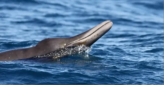 The physical description can however be made from the stranded whales. They appear with a bluish gray or slate gray upper side and a light underside. They have a small rounded melon in front of the blowhole (only 1 blowhole since it is a toothed whale!) and a small dorsal fin. Their body only has limited scarring and their beak is long and slender.