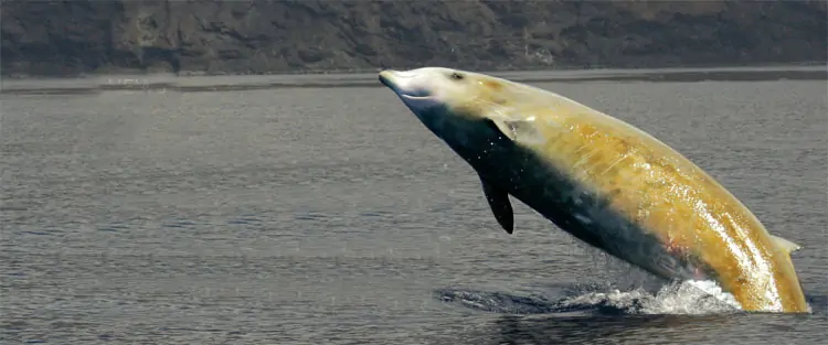 Individual breaching with the two throat groves visible and greenish coloration n the its flanks probably due to diatom algae growing on the skin.