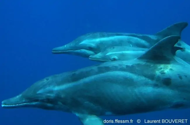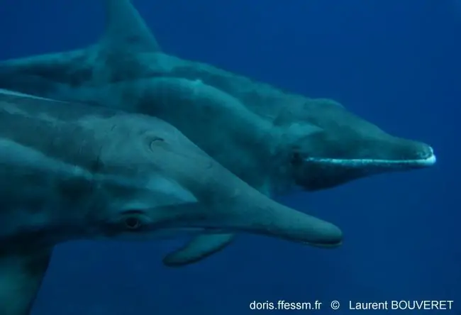 The Rough toothed Dolphin are frequently in groups of 10-20 individuals, but can reach up to 100 animals. Relatively inactive compared to other dolphins, they travel at around 3-6 km/h but can swim faster, up tp 24 km/h. Rough toothed Dolphins are skimming when they breath, they do not put the head and chin above the surface. On many Rough toothed Dolphins, their skin leave proofs of attacks by Cookie-cutter Shark (Isistius brasiliensis).
