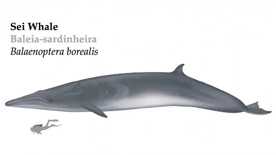 Sei Whale is the third largest animal after the Blue Whale and the Fin Whale. « Sei » is the Norwegian word for pollock Pollachius sp., a North Atlantic marine fish. Sei whales are used to appear off the coast of Norway at the same time as the pollock do, both coming to feed on the plankton.