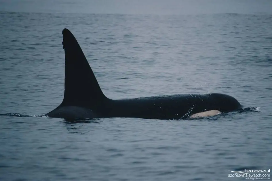 One of the adult males of killer whale (Orcinus orca) that Terra Azul boat encountered along the coast of Sao Miguel Island. The faint grey dorsal saddle behind the the dorsal fin is another characteristic shared with Eastern North Atlantic Type 2 Orcas.