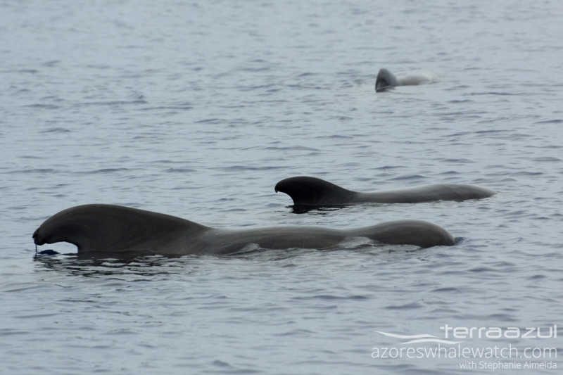 To confirm the species we need to be able to see the pectoral fins, which is their main difference. Because here in the Azores it is more common to occur the Short Finned Pilot Whale, we are going to assume that these were the ones we spotted.