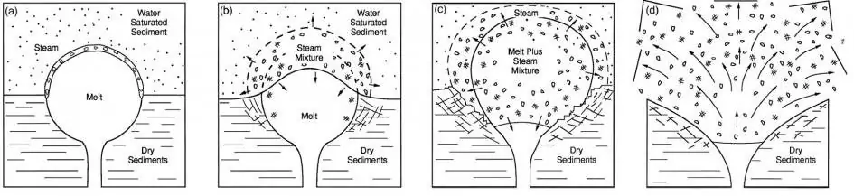 Visualization of subsurface hydrovolcanic activity. (a) first contact of magma with watersaturated sediment, (b) development of vapor, (c) mixing of the components, (d) explosion due to high pressure of the steam. Source: Wohletz, Zimanowski & Büttner.