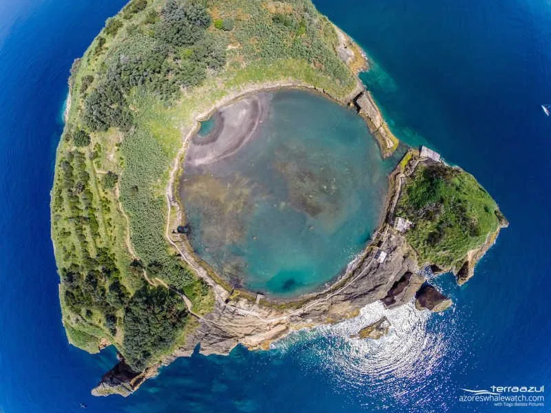 Top view of the Ilhéu de Vila Franca, with visibility of the perfectly shaped remains of the ancient crater, which is now a natural pool with a depth of ~1-2 meters