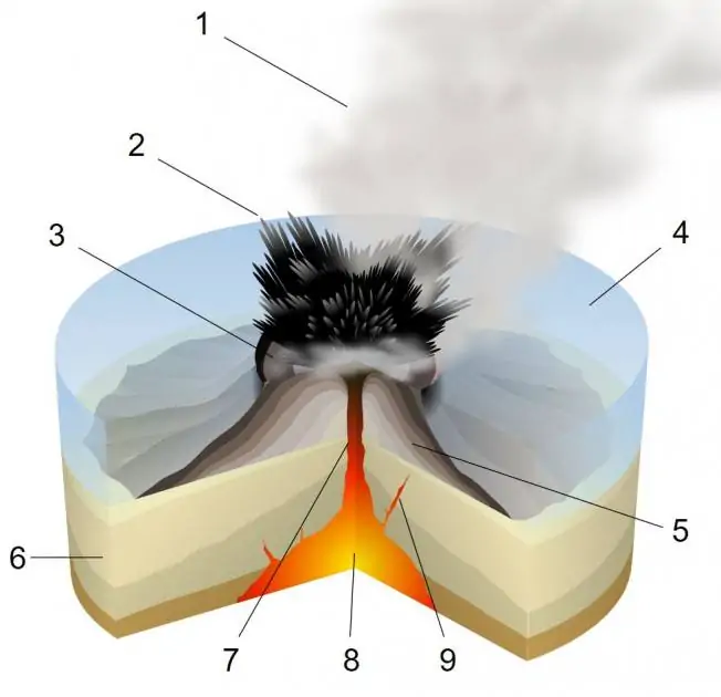 Scheme of a surtseyan eruption: 1. Water vapor cloud, 2. Cupressoid ash, 3. Crater, 4. Water, 5. Layers of lava and ash, 6. Stratum, 7. Magma conduit, 8. Magma chamber, 9. Dike. Source: Sémhur.