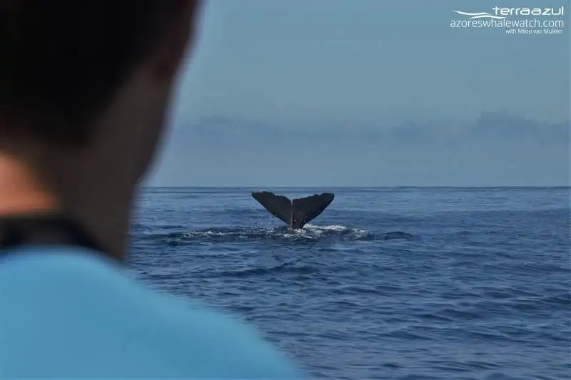 Three fin whales were feeding as well, quiet close to the coast, making circles around us to catch krill, their favourite food. Close to them 2 Sperm whales showed up. One of them came straight to us and spied on us as they like to do, just before taking a deep dive and finding some squid to chew 🙂 A funny note is that, in the afternoon, some Bottlenose dolphins joined the resting fin whales. Because of the active movements of the dolphins, the whales started to swim away faster. Maybe they were annoyed, who knows 😉
