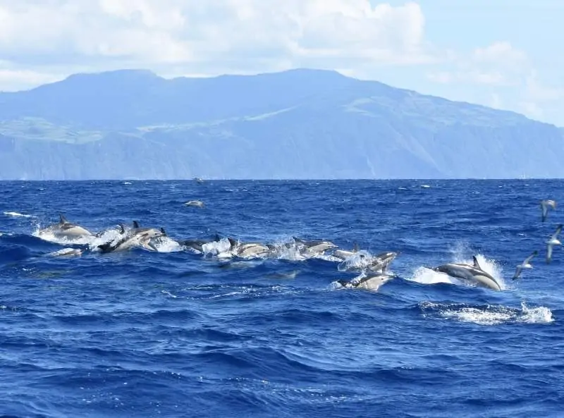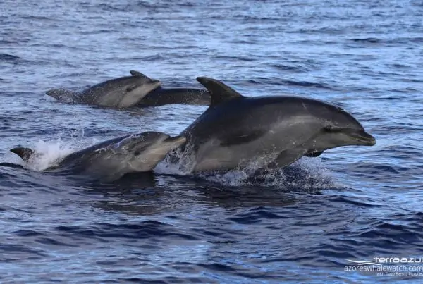 We saw 3 species today: Common Dolphins, Fin Whales and Blue Whales (inclunding a calf). The groups of Common Dolphins were very intresting. The one we saw in the mornig were feeding and in the afternoon they were very playful, jumping around. There was one that started to make really high jumps, it was very funny!