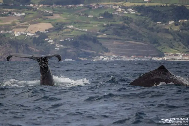 The morning continued to surprise us with two blue whales foraging together with a fin whale and two additional fin whales approaching Terra Azul boats before diving. We ended our tour with a nice group of bottlenose dolphins close to Vila Franca do Campo. In the afternoon we had again blue whales and common dolphins.
