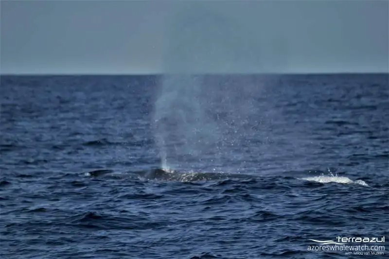 And so we went….almost 50 minutes to get to the area of the Sei whales, while on the way some sudden Atlantic Spotted dolphins joined us for the run, and started to jump towards the boat. But, no time to stop for them right now! Once arrived at the spot, the hide and seek began as usual. Sei whales are often hard to locate because they are so fast, and have the tendency to change direction all the time. While waiting, the Atlantic Spotted dolphins appeared again, but this time another group. They were very active foraging for fish and socializing, and showing their spotted bodies perfectly.