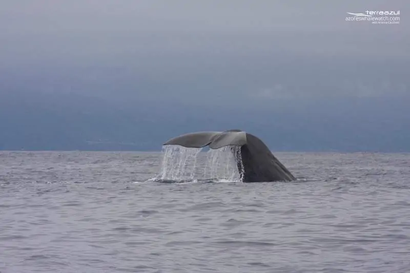 The huge solitary sperm whale was very likely a male due to its size, as males can reach 18 meters, while females are on average 12 meters. Males also have a prominent head as we could see today, females on the contrary have a much linear shape. When we arrived we had to wait for about 10 minutes, after which the sperm whale came to the surface to rest for few minutes and eventually it took a deep dive, meaning for us a beautiful tail to see! 🙂