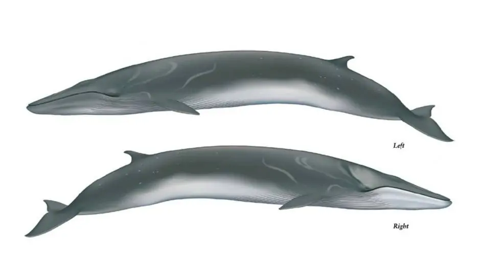 Fin Whale (Balaenoptera physalus) lateral body view. The asymmetric coloration of the head is a key feature to recognize this baleen whale species. Source: Encyclopedia of Marine Mammals IIIrd Ed. Bernd Würsig, I. G. M. Thewissen & KIT M. Kovacs Editors.