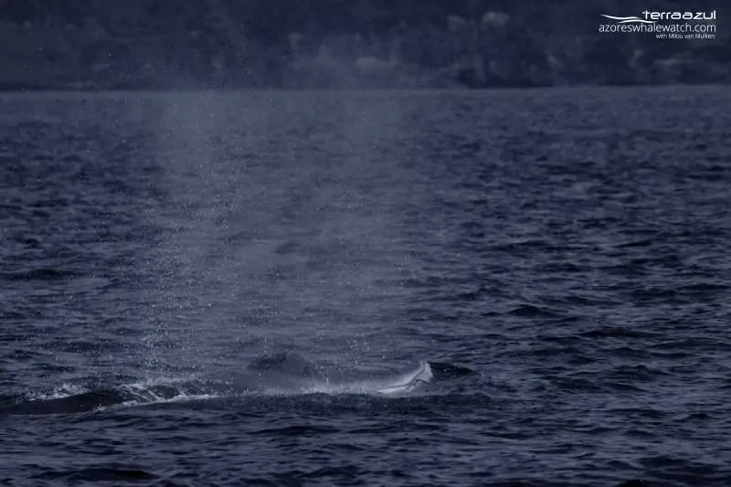 In the afternoon it was not sure if we could go out because some rainpatches and dark weather were blocking the view, but after 40 minutes (thank you to the very patient clients!) we went out initially with a group of Bottlenose dolphins, and then got surprised by the presence of 3 large Fin Whales!! The Fin Whales were very far out on the sea, to the South West of Sao Miguel, and we got a cold rainshower on our way towards them. But…as very often in life we have to go through rough weather to reach a beautiful destination 🙂