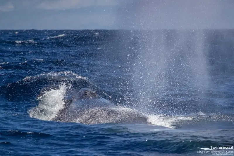 The Fin Whales came close to our boat and at least blowed their blowholes 25 times. In a period of 1 hour we observed how they made several shallow dives of about 5-10 minutes each. Once we thought we lost them for 20 minutes…but suddenly those huge whales just surfaced right next to our boat!! It was an incredible sighting. They were feeding during the whole trip….that’s exactly what they come for the the Azores….passing through our waters while moving to their feeding grounds. Meanwhile they will also feed here but their real feeding and breeding grounds are elsewhere.