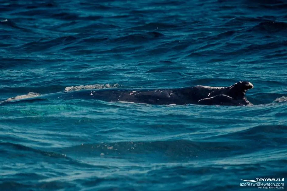 A sub-adult Humpback Whale (Megaptera novaeangliae) slowly cruises alongside Terra Azul boat around six nautical miles out of Lagoa shores, Sao Miguel Island.