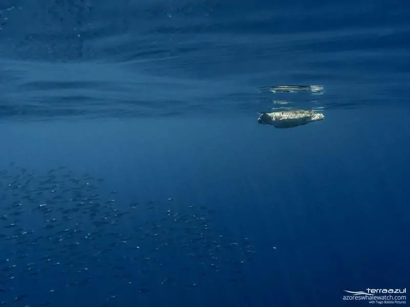 After this we made our way back to the land – or so we thought. Half of our way back we sighted another large and active group of dolphins on the horizon, which turned out to be Atlantic Spotted dolphins! The second time we saw them this season, as they have only arrived last week to spend their summer here. Even 2 Loggerhead turtles were floating on the surface near the dolphins, with hundreds of fish underneath them.