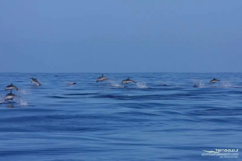In the morning we started with a few individual Common dolphins that were still in the weekend mood. (Monday mornings can be hard right!) Then we quickly moved to what would be the highlight of this tour: a pod of about 200 Striped dolphins, but as perfect as they could be! They kept a straight course for about 10 minutes, while continuously migrating/ jumping out of the water with the whole pod. The babies were happily joining the adults on this jumpfest!