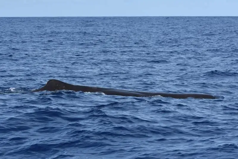 Our bright eyed skipper, Nuno AKA Dennis, spotted a big blow out of nowhere, without notice of our lookout. Of course, Nuno was wearing 3 pair of glasses: his reading ones on his head, 1 polarized pair on his face, and another sunglasses around his neck. With so many options, it was no surprise that he found us this magnificent animal all by himself! It seemed to be a juvenile, and she was taking lots of shallow dives, but we got to see her pretty well.