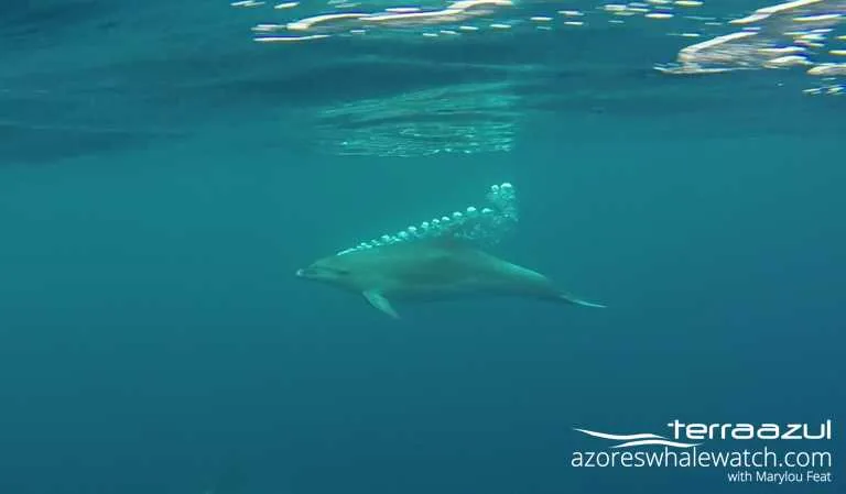Atlantic Spotted Dolphins (Stenella frontalis) that left our guests feeling amazed, spotties travel in big groups and no matter how many times you see them it is impressive every single time, because of the size of the pods that can be here in the Azores of hundreds of individuals. They as you may know already are born with a grey coloration that gets colored spots when aging, like humans get wrinkles dolphins get spots, making it easier to differentiate adults from younger dolphins in a pod.