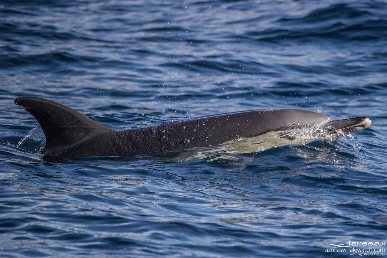 Soon we headed for a group of about 25 Common dolphins that were first resting, and then feeding on tiny fish. We stayed for a good amount of time with them as this was the only species sighted today. It seemed like there was at least 1 small animal in the group. That is very possible, as Common dolphins give birth all year long. However, peak season is between early spring and late summer. Did you know that pregnancy of Common dolphins is between 10-11 months? That is much longer than humans. No wonder that they are such a developed creatures 🙂