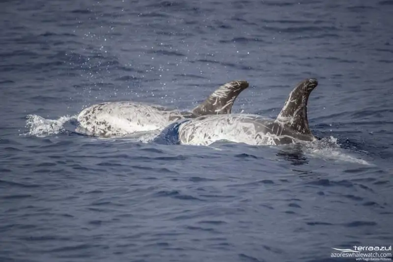 Then, our loockout saw a group of Common Dolphins. This ones were also feeding but they weren’t so active, after a while we noticed that we were not alone…In the same area, mixed with the Common Dolphins, was a little group of Risso’s Dolphins feeding as well. In an attempt to see more life, we saw another group of Common Dolphins socialazing and jumping around, much more active.