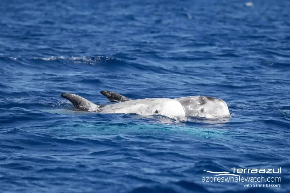 During our last tour of the day, we came across a small group of Common Dolphins (Delphinus delphis), and Risso’s dolphins were seen again but this time in bigger numbers. We observed not one, but TWO pods of Risso’s dolphins! In contrast to the morning, it was immediately clear that we were not only watching a bunch of adult males…this time there were also some females with their offspring. During all three encounters of this day, the Risso’s dolphins were mostly travelling. Risso’s dolphins appear to hunt mostly at night and during the late afternoon, while during daytime it is more common to see them socialising, travelling and resting.