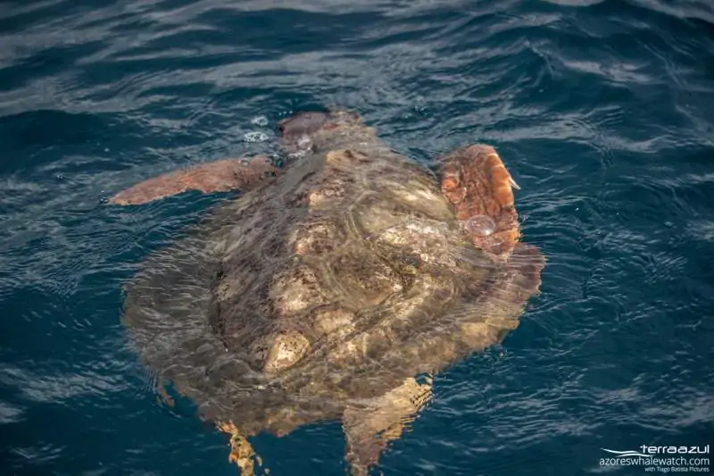 Not too far from the dolphins, a loggerhead turtle was resting, lazy and calm, possibly also enjoying the waves.