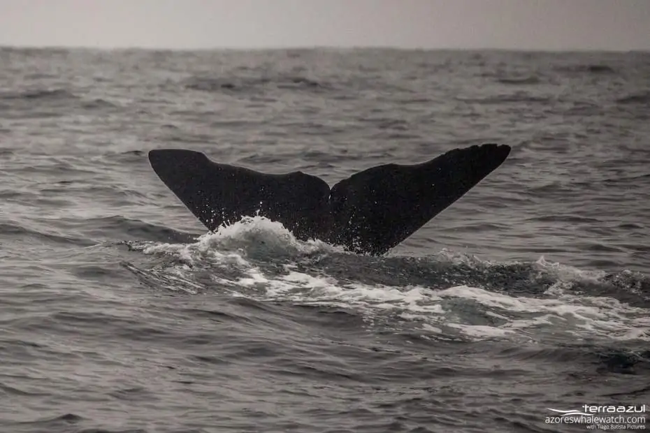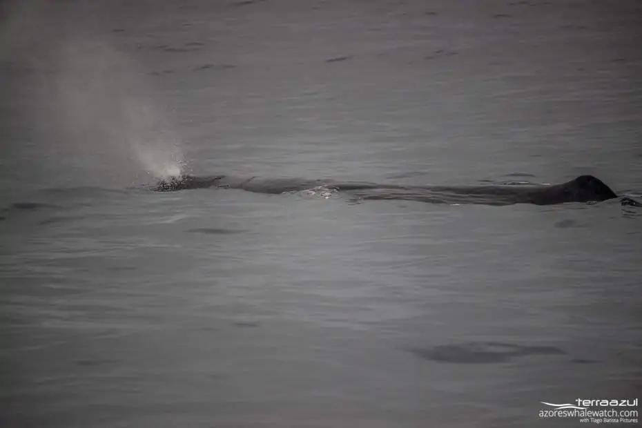 Then our lookout Filipe was noticing some blows VERY far away, about 10 miles (1 mile = 1.6 KM so you can do the maths…) The problem was that the visibility was not good and by the time we would reach the area, we were expecting the Sperm whales to be long gone on their deep dives. But, we try! When we arrived after a cold and cloudy trip, we were at the exact spot were Filipe saw the whales the last time. We stopped, and he communicated to Tiago, the skipper, that it was going to be difficult because he lost complete visibility in the thick fog.