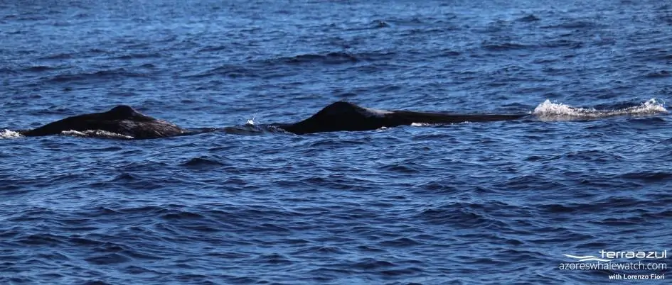 We spotted the same group of common dolphins twice, and in both occasions they were socializing. Adults, juveniles and calves were interacting and vocalising a lot as we could hear from the hydrophone. While we were enjoying the dolphins, Filipe spotted some blows further in distance and there we went, a total of 6 individuals were hanging around, including a mother and calf pair. Also the sperm whales were vocalising, likely keeping in touch one another as they were spread out. The visibility was really good today, we could even see Santa Maria island at the horizon, so it is not that strange that Filipe spotted these whales at 14 miles from the coast!