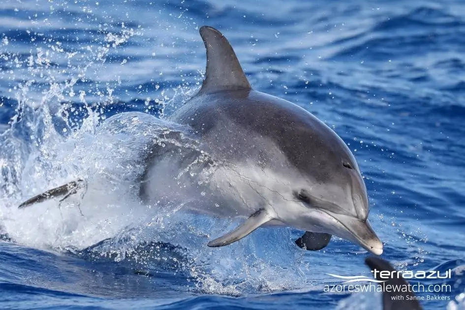 During the summer months, the Azores are an attractive place for tourists from all around the world. Not only tourists of the human kind, but also of the cetacean kind! Yesterday we encountered two such species that migrate to the Azores and show up in summer time. We started the day with multiple groups of Atlantic Spotted Dolphins (Stenella frontalis); a small species of dolphin that typically greets us with energy and joy aplenty. Full of excitement they came flying out of the water, racing towards our zodiacs.