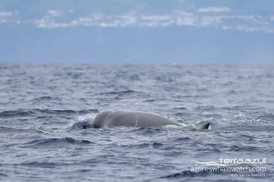 In between all the dolphins, we got news about the presence of whales in the area. Blows were sighted! We were anticipating on finding sperm whales…but what we found was completely unexpected…the whales had curved dorsal fins!!! They were not sperm whales, they were NORTHERN BOTTLENOSE WHALES! The Northern Bottlenose Whale (Hyperoodon ampullatus) is the largest of the beaked whales that can be spotted in the Azores. They can reach lengths of up to almost 10 m. They are extremely good divers; regulary diving down to over 800 m, sometimes diving for 60 minutes or longer.