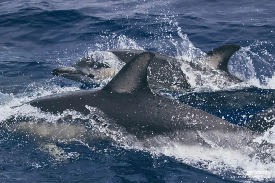Due to the choppy sea and high swell there was no possibility of staying dry even with our skillful skippers in charge of driving us in this adventure called whale watching. The adventure got more exciting with the presence of a nice group of common dolphins, which were porpoising, meaning they were leaping out of the water while travelling on a sustain pace. This allowed us to see them very well despite the wavy ocean.