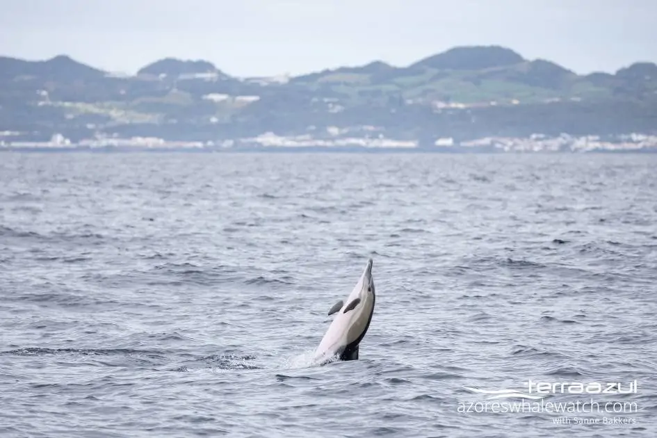 Ooh-la-la, the 8th of January turned into a magical day for our whale watchers! As we left the harbour of Vila Franca do Campo, we crossed the Princess Ring Islet to make our way west. Our first destination: a pod of Common Dolphins (Delphinus delphis). The group we encountered consisted of around 30 dolphins, including adult males (easily recognised by their peduncle keels), adult females, and juveniles. Looking at the way they were moving around the area, the dolphins might have been foraging for fish. Common Dolphins are one of the most frequently sighted cetacean species in the Azores, and, thanks to their beautiful markings and energetic nature, they often bring “colour” to our winter days.