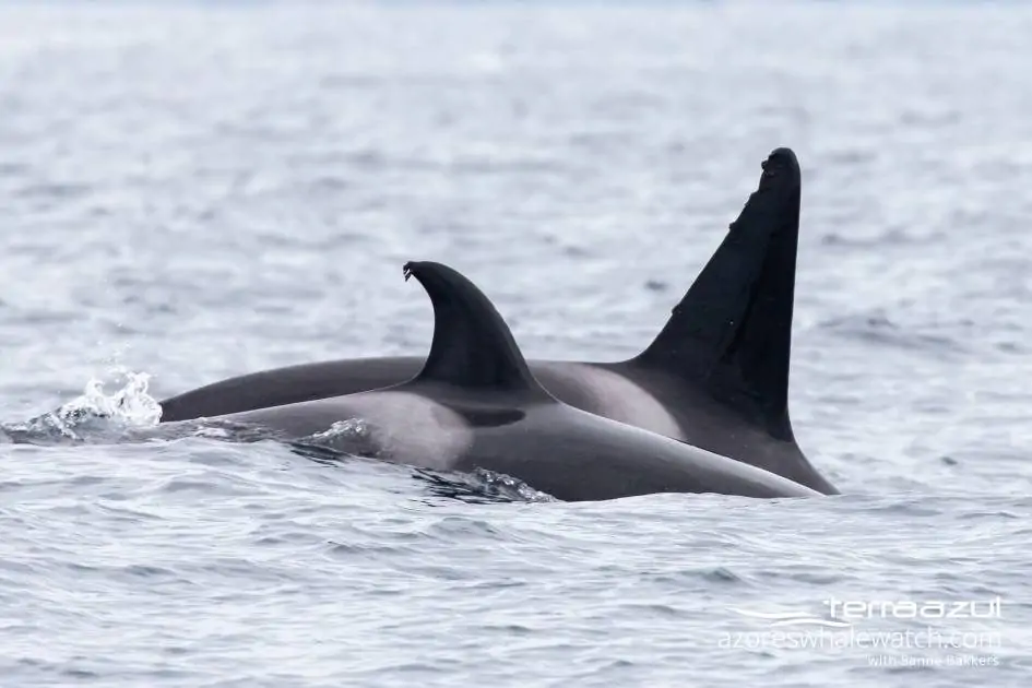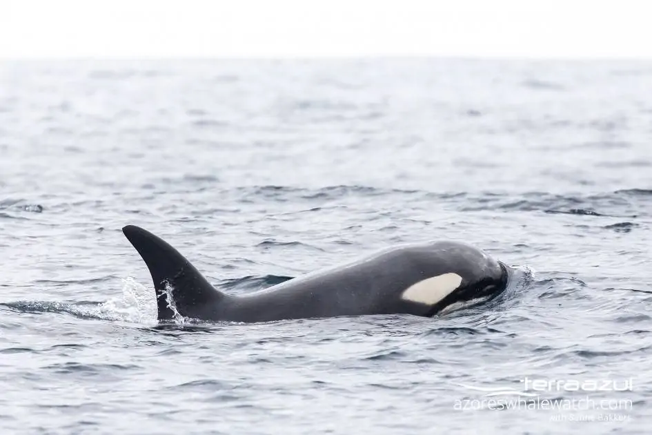 After our pleasant encounter with Common Dolphins, we still had a lot of time left to search for something else. Following the directions of our lookout Nicole, we ventured further away from the coast. We were in for something special, though we did not know at that moment. We ended up 13 miles away from Vila Franca do Campo. Waiting in relatively calm seas for another species of dolphin to appear on the surface. Perhaps bottlenose dolphins or Risso’s dolphins? While some of our guests required a quick bathroom break, a tall fin appeared in the distance. A dorsal fin taller than any bottlenose dolphin or Risso’s dolphin fin…that’s when the suspicion kicked in…COULD IT BE?!?! They are a rare sighting in the Azores; loved by many; and we almost lose our minds when we hear their name on the radio…could it really be ORCAS?!?! Our suspicion soon became reality! Four ORCAS or Killer Whales (Orcinus orca) passing through Azorean waters, south of São Miguel Island.