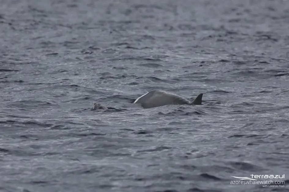 We were heading back towards the marina when out of the blue at 11:35, three of our customers spotted Beaked whales. Our skipper Tiago was fast enough to realise that this encounter was fascinating. We had not seen beaked whales for 3 months. Beaked whales if you will, are a group whales belonging to the Mesoplodon genre. The are deep divers and are in Azores what we call “rare sightings”. We most likely believe that this mother and calf belonged to the Blainville’s beaked whale species (Mesoplodon densirostris). In order to correctly identify these animals you need to be close and observe the beak and coloration of the animal. You can read more about beaked whales on our published post HERE!.