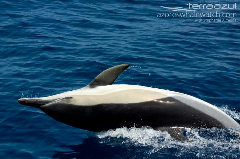 Being precise a huge group of at least 60 individuals or even more (not so easy to estimate, as they are always moving 😛 ). The sea was calm and the dolphins super relaxed! Lucky us, as it was very nice and easy to observe them as they just stood close to the boat without moving a lot. Amongst them, we could see several babies and juveniles. Especially the babies are just lovely being sooooo small and giving their best to keep up with their mothers and the group. One of the babies called particularly our attention as it was considerable lighter as the others. We are not sure but might be an albino??? 😉