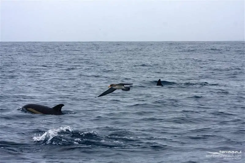 Seabirds often take advantage of the cooperative behaviour of dolphins searching for food, following them and partaking to the final banquet. Common terns were feeding at surface, mostly taking advantage of the leftovers. One of the shearwaters, on the other hand, took a dive.
