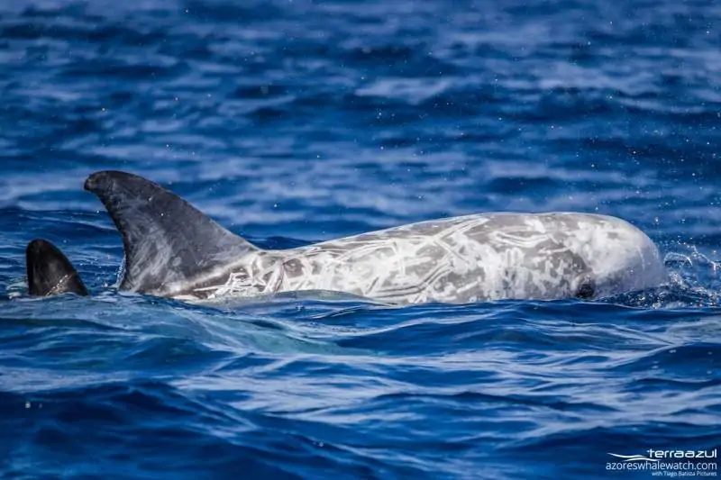 As if this was not enough, on our way back to the island we encountered a small group of Risso’s Dolphins (Grampus griseus). We saw two almost complete white coloured adults swimming next to each other. Because of the white colour we could follow them very easy under the water surface. Risso’s Dolphins become much paler with age and they can have numerous scratches and scars on their body. They were quite shy, but oooh sooo amazing!