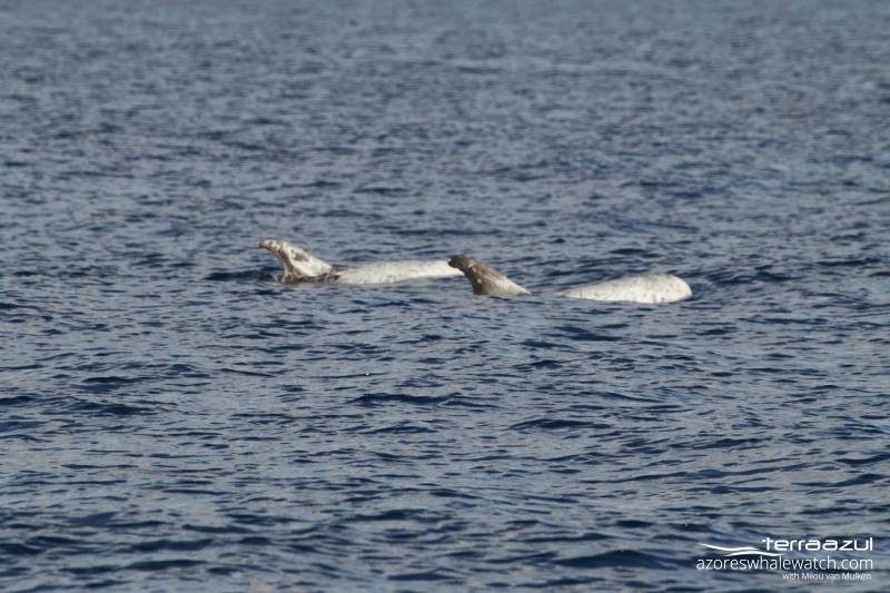 As if this was not enough, on our way back to the island we encountered a small group of Risso’s Dolphins (Grampus griseus). We saw two almost complete white coloured adults swimming next to each other. Because of the white colour we could follow them very easy under the water surface. Risso’s Dolphins become much paler with age and they can have numerous scratches and scars on their body. They were quite shy, but oooh sooo amazing!