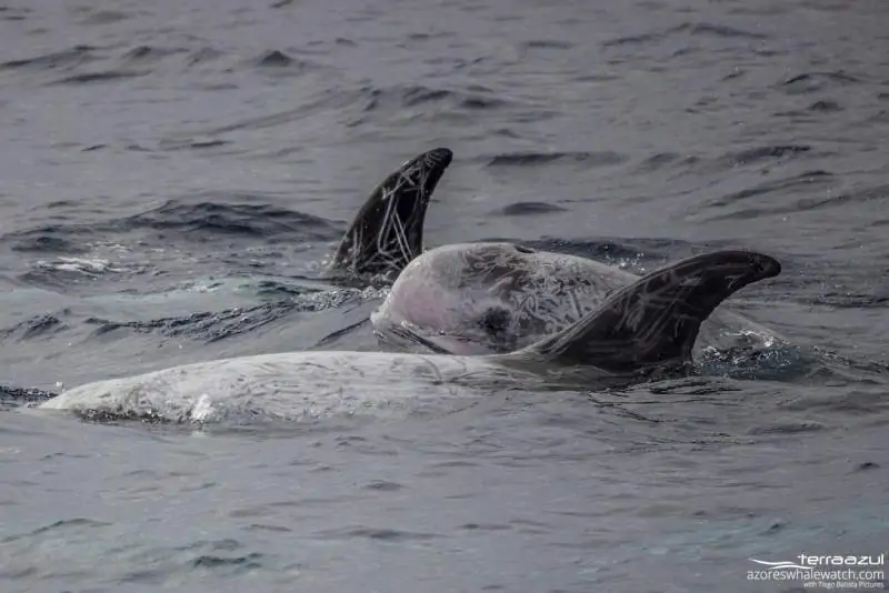 We were also travelling, until suddenly one of the guests screamed that he saw a big fin! Good point, we just passed a small pod of Risso’s Dolphins (Grampus griseus). These heavily scarred dolphins do have a conspicuously erect fin. We saw immediatly the scratches on the pale body, so we could recognize the species very quickly!