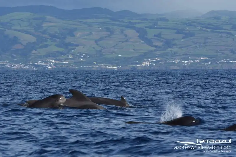 We started with the Risso’s Dolphin. Beautiful as always, very relaxed. We could see some oldest individuals and more adults. Then our lookout had a surprise for us…Pilot Whales. We went to the area to check it out and we found some calves next to the mother, some juveniles and adults, it was really nice to see. We spent some time with them and then we went more close to the coast to show our lookout’s spot. We always find intersting to show how it works on the other side 🙂 .