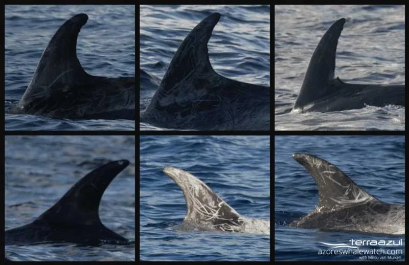 Today is a good day to solve some puzzles! In the morning trip we saw a group of at least 8 different Risso’s dolphins, that are easy to distinguish from each other by the marks in their dorsal fins. In the photo above you can see 6 dorsals from 6 different individuals from today. We would like to involve our clients from all previous years to do some puzzling – checking your old dorsal fin photos and maybe recognize some of yours, to be the same as the ones we saw today. Chances are pretty big that some are the same! Even better, you can go to the Monicet website here: http://www.monicet.net/en/catalog