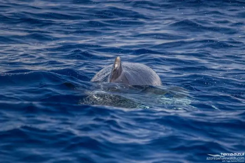 The morning tour we started with a group of Risso dolphins. They were travelling and also continued their activity when we arrived there to observe them. The group was quite dispersed and they disappeared time after time for a dive. It was not so easy to keep an eye on them. However there was a really tiny baby in the group, always swimming close to its mum. It was amazing to observe the contrast between mother and baby when coming up at the surface for a breath, the mother being light grey and the baby dark grey.